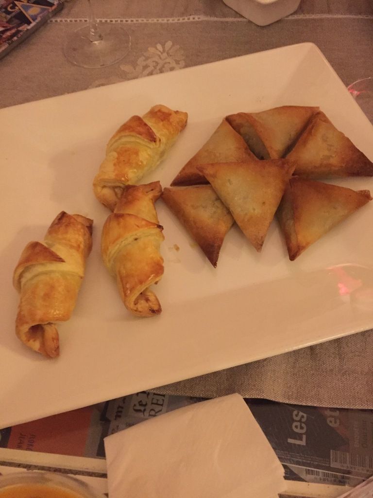 Autre proposition pour l'apéritif, des petits samoussas au boudin noir et des croissants au jambon de parme et pruneaux.