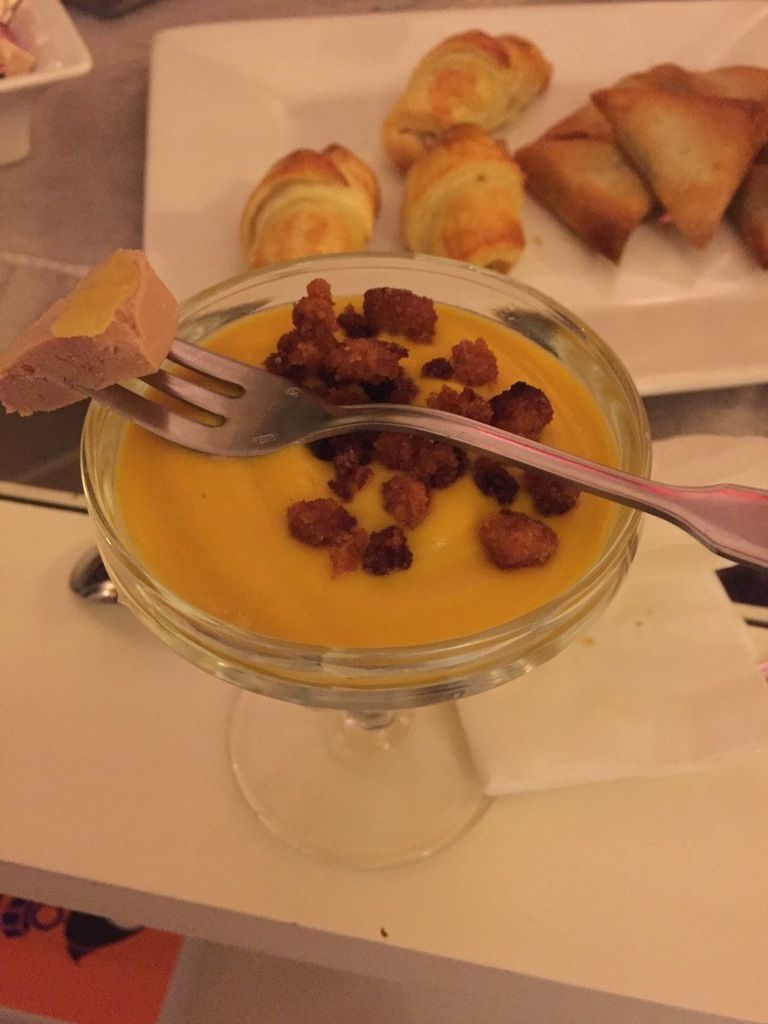 J'ai fait un mix entre deux recettes présentes dans la revue : l'une proposée dans la rubrique amuse-bouches : un velouté de potimarron au foie gras et l'autre dans la rubrique hors d'oeuvre : une crème de potimarron et crumble de pain d'épice.